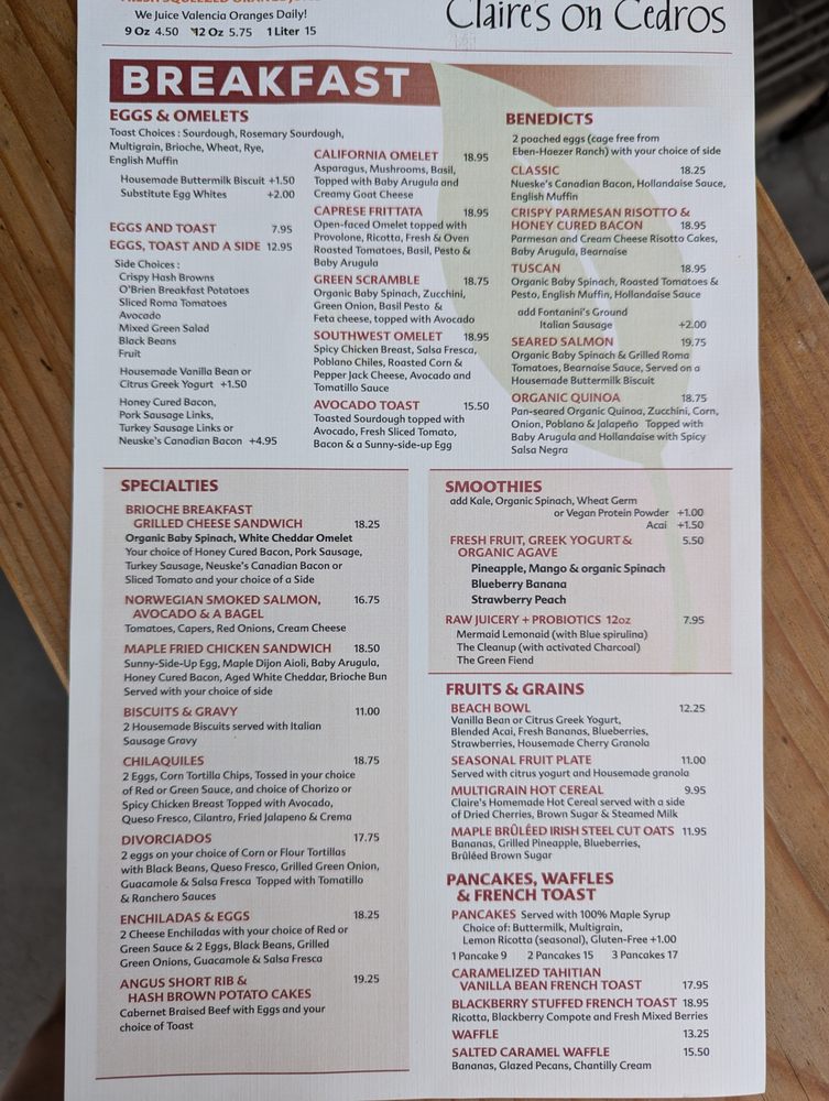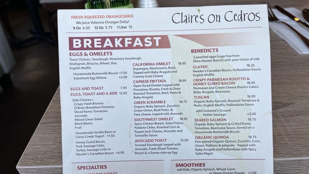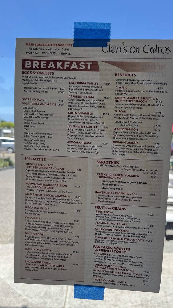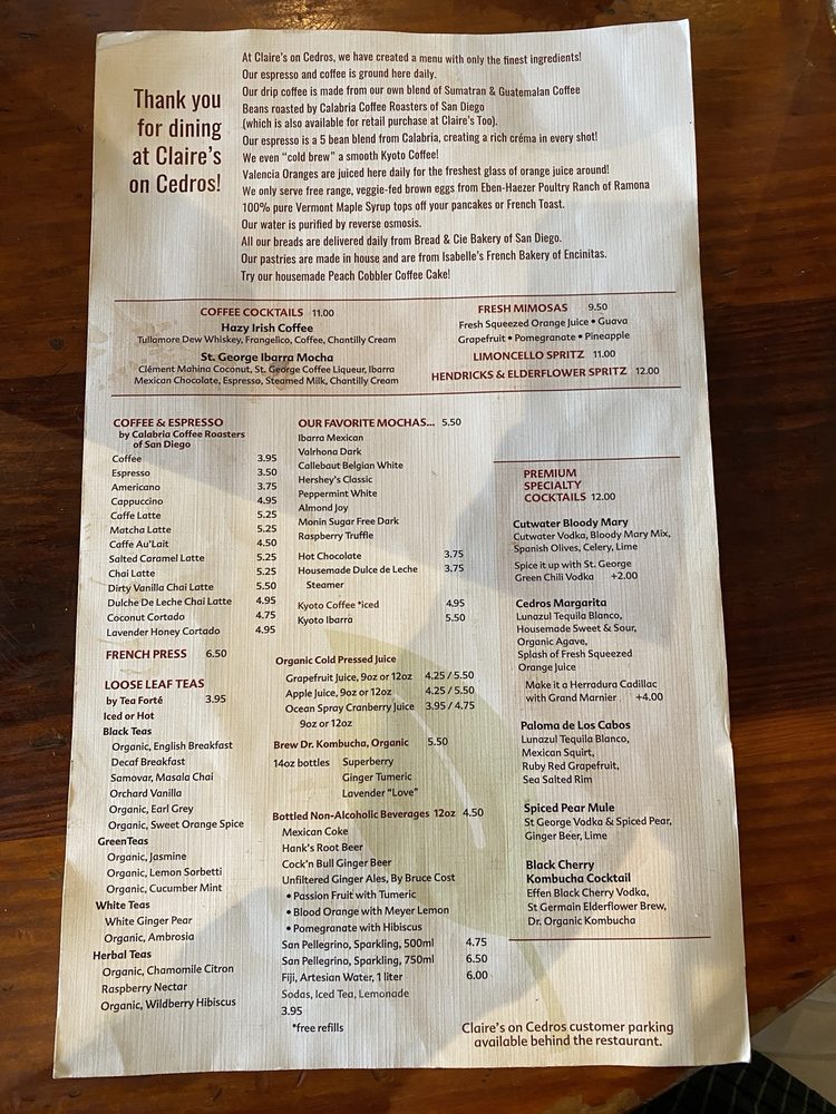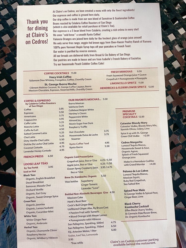 At Claire's On Cedros in Solana Beach, breakfast and brunch shine with their unique menu offerings, including Salted Caramel Latte and Parmesan Risotto and Cured Bacon Benedict. Customers rave about the cozy ambiance, extensive outdoor seating, and attentive service. The restaurant is dog-friendly, offers free Wi-Fi, and has a diverse menu suitable for all dietary preferences, including vegan options. With a focus on sustainability, Claire's On Cedros provides compostable containers and plastic-free packaging. The Maple Fried Chicken Sandwich and Italian Sausage and Ricotta Flatbread are highly recommended dishes that pack a flavorful punch. Despite occasional delays in service, the overall experience is worth the wait, making Claire's On Cedros a must-visit spot in the area.